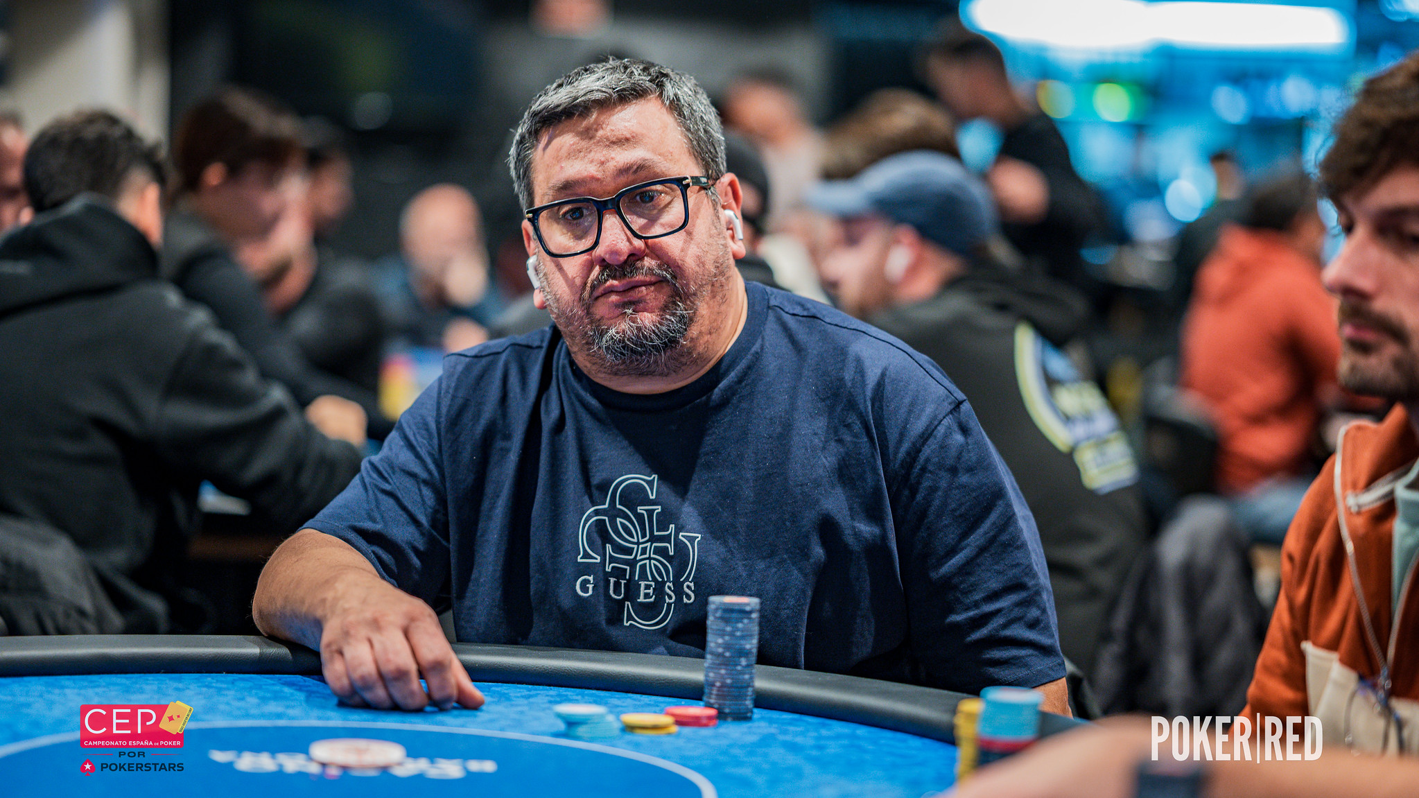 Unas manos después de foldear el all-in en river contra Guillem Nuez, nos hemos encontrado a Toño Pérez con unos 19.500 puntos cold4-beteando all-in en SB.