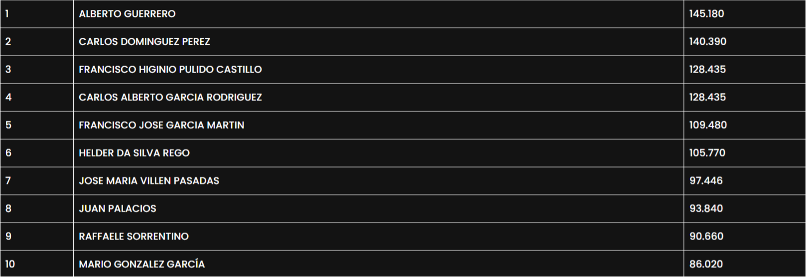 Carlos por su parte fue el tercer clasificado en la primera etapa de Sevilla y ha conseguido varios premios más en eventos paralelos que le han aupado a la segunda posición.