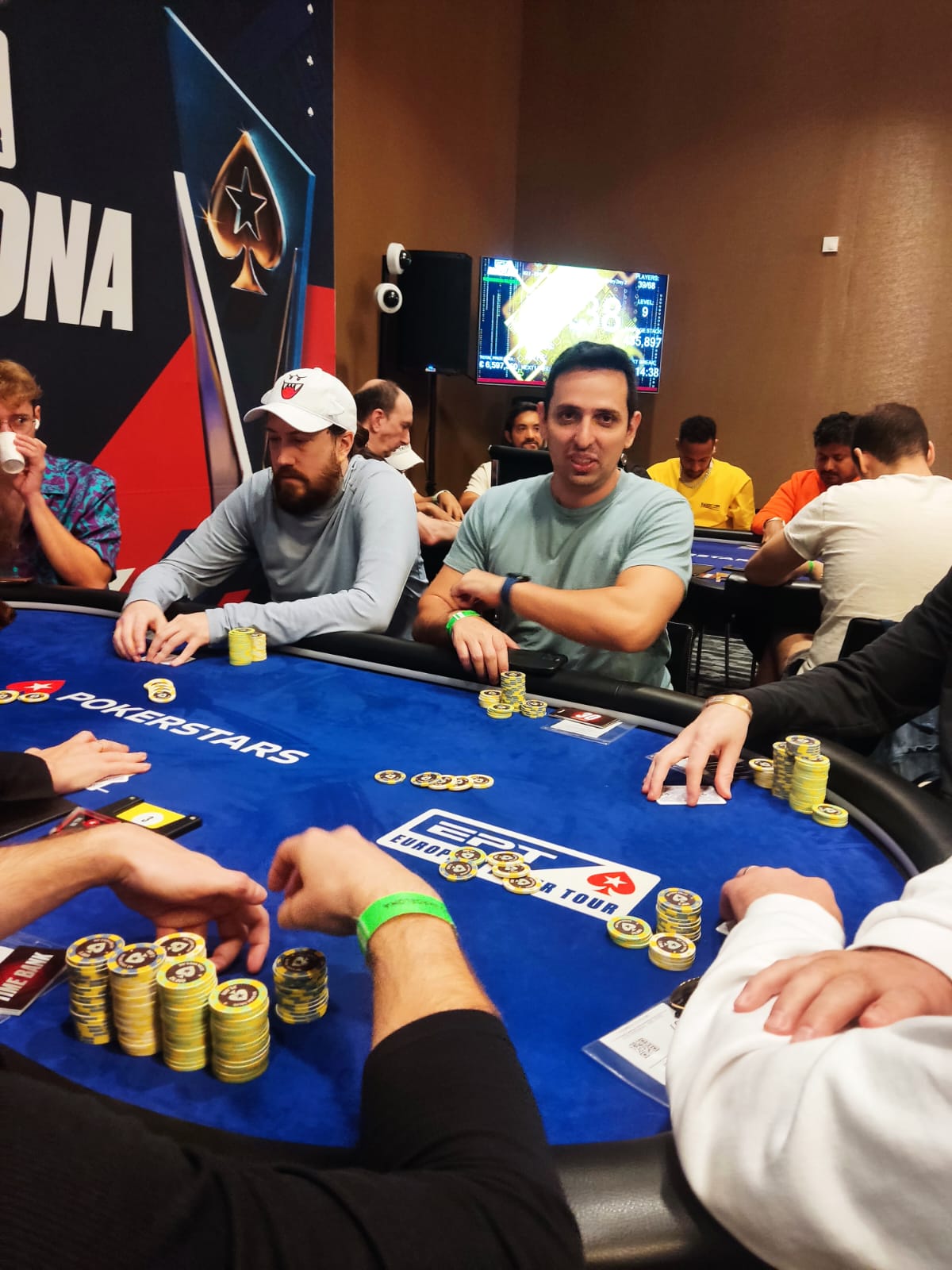 Seguimos en el nivel 2 del Main Event. Estábamos en la zona de la Sala Gaudí donde están abriendo mesas y donde se estaban sentando Lander Lijó y Javi Fernández cuando hemos visto aparecer a Sergio Aído, que venía buscando su mesa porque había caído eliminado del €100k.