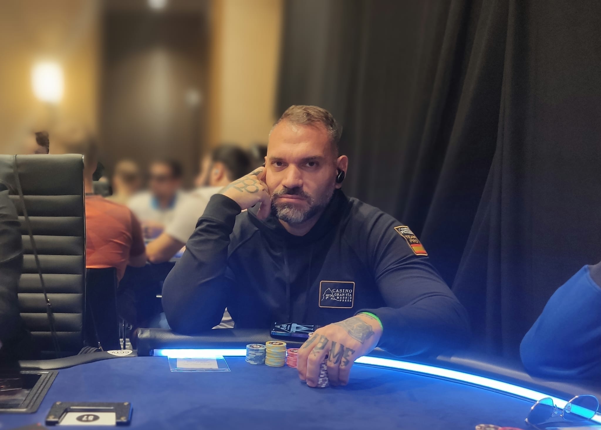 En la mesa de al lado de Lander está sentado Sergio Fernández, que ya acusa cansancio y dolor de espalda y ha decidido darse un masaje mientras juega. Le vemos con un stack que supera los 40.000 puntos, por lo que ha conseguido ganar unas ciegas en esta primera mitad del día.