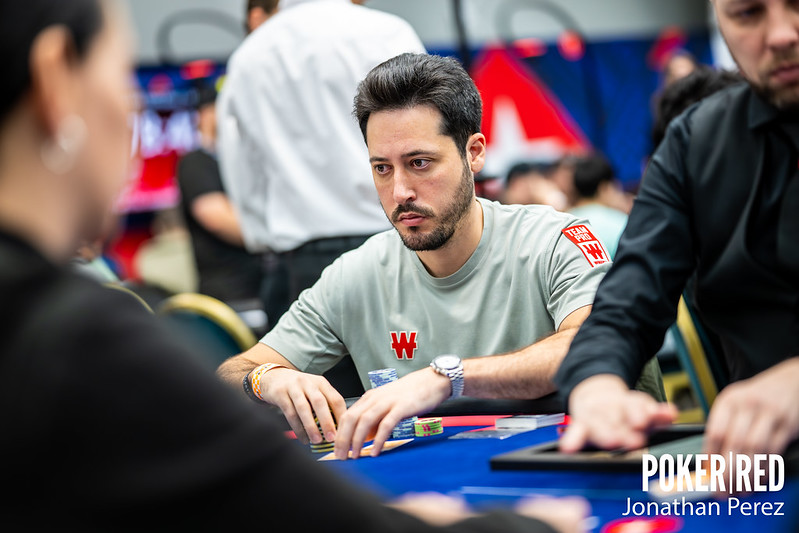 Llegamos a la mesa de Adrià Calonge con un montón de fichas en el centro y el español cavilando en un board  KhJd2d3dJh.