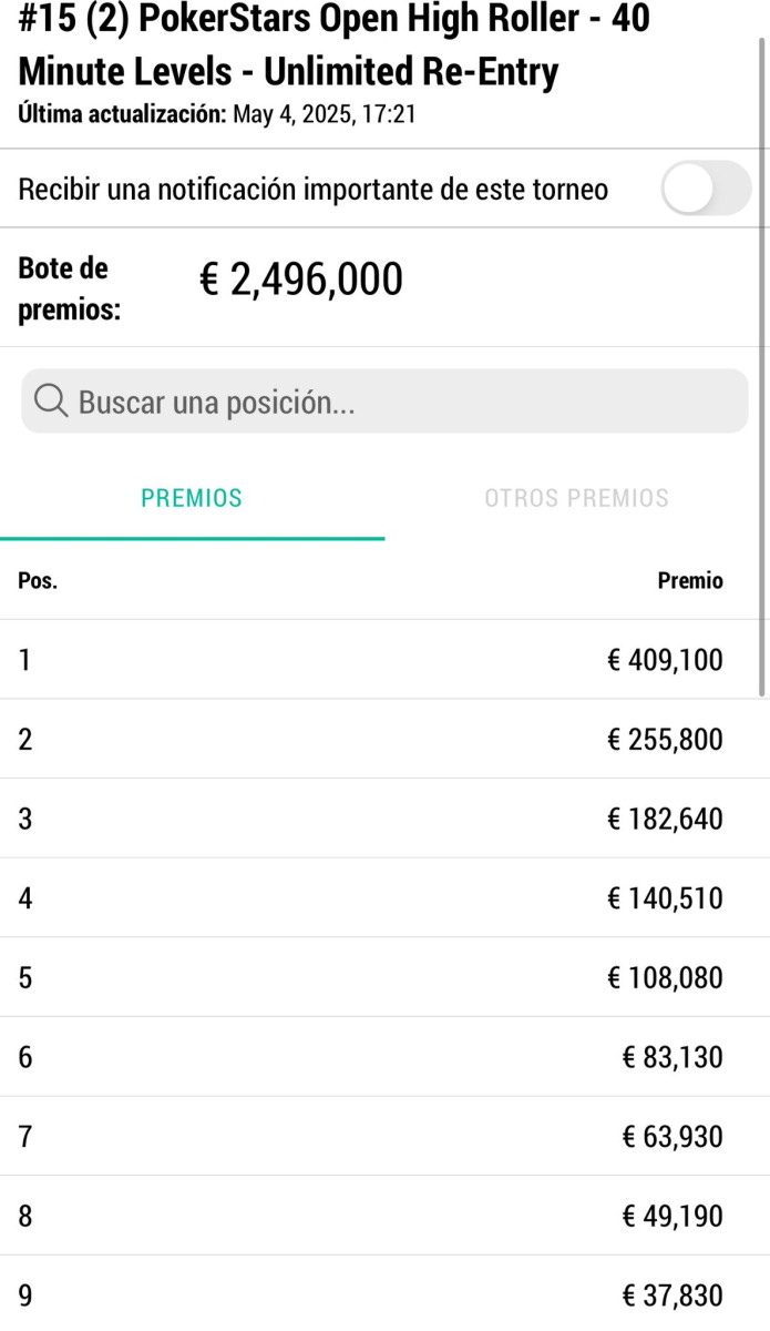 El 9º clasificado se asegura 37.830 €, pero es que el campeón, además de la pica, se llevará la friolera de 409.100 €.