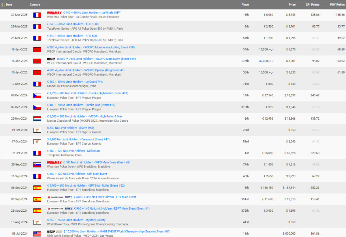 El francés tiene más de 1.000.000 $ de ganancias en torneos en vivo y el año pasado se quedó a las puertas de la mesa final en el torneo más importante del mundo, el Main Event de WSOP.
