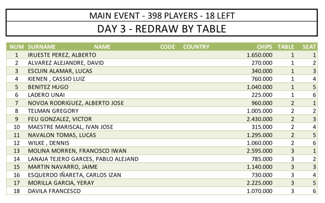 En cuanto al Main Event, quedan solo 18 jugadores y en cuestión de unos pocos minutos dará comienzo el Día 3, con el siguiente seat draw: