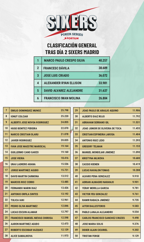 El gran triunfador del Día ha sido Oscar Fernández, que llegó a este Día 2 con 206.000 puntos y ha terminado liderando a los últimos 24 supervivientes con un stack de 2.825.000 puntos.