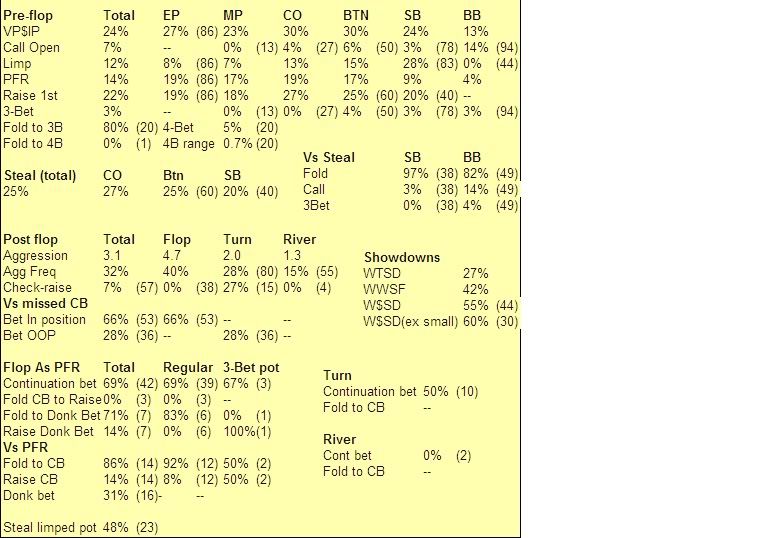 El caso es que aunque tiene un OR en early alto no parece tan loose como para meter la 4a con un rango amplio. Yo lo pongo en AK, QQ+, y aunque el mono se meta, creo que no es rentable