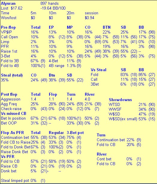 Yo me fijaría en call open, fold cbet, WWSF y W$SD. La mano la juego, bet 0.6 pot flop, bet 1/2 turn, check/fold river.