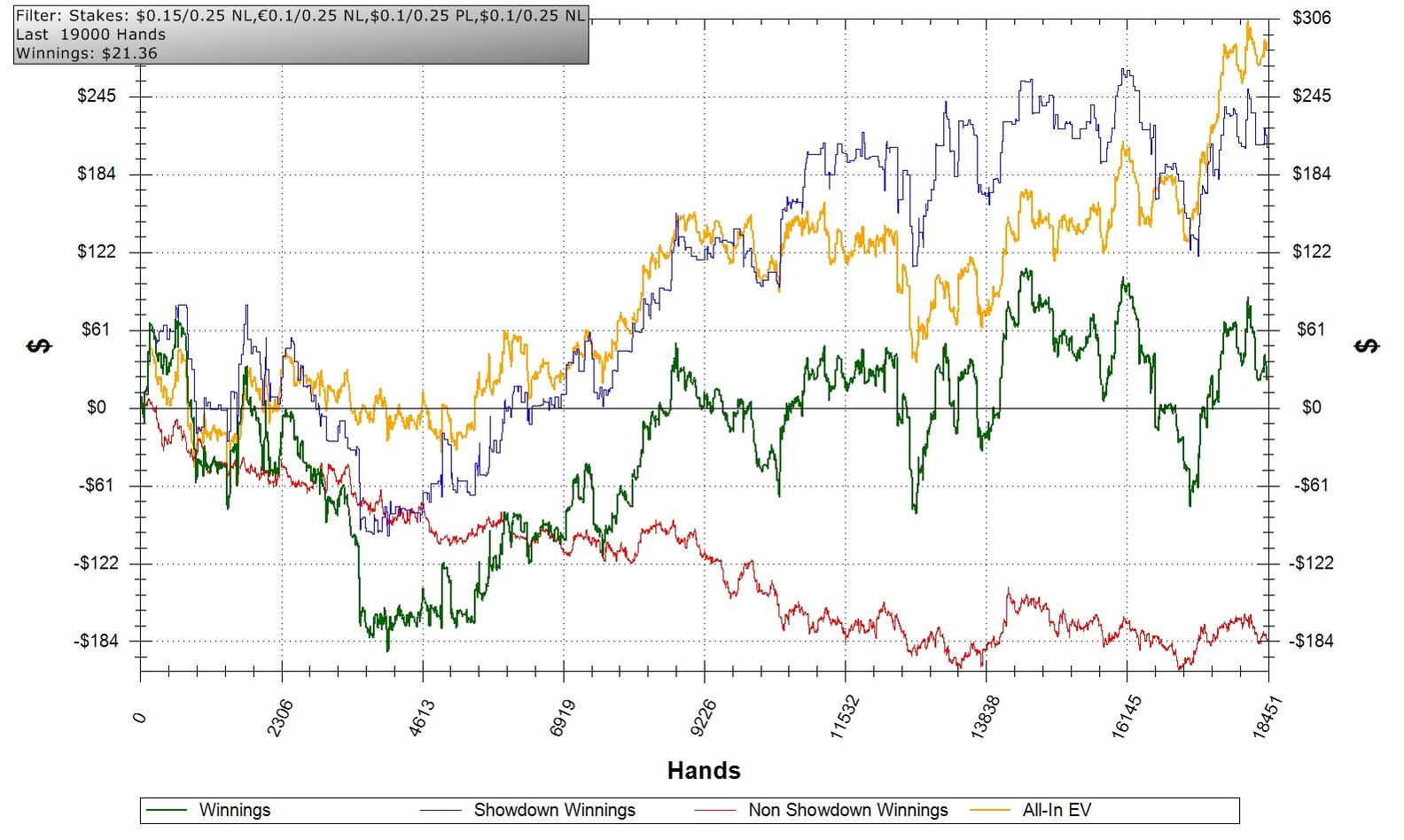 Tampoco entiendo como con esas stats tienes las NSD en negativo en las últimas 19K manos, igual es simple varianza y en los botes gordos estas runeando mal y se te complican los boards, obligandote a foldear.
