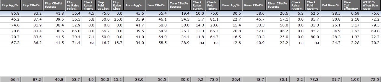 He revisado por encima y creo que el problema se debe al bajon de cbet en turn y sobretodo en river (menos bet bet bet), pero como ya digo yo no he cambiado mi juego conscientemente y no se si puede ser varianza (me extraña) o realmente estoy haciendo cosas mal.