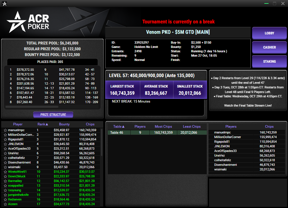 Tras tres intensos días de competición se ha formado la mesa final del Venom PKO, un torneo que partió con un garantizado de 5 millones de dólares, pero que finalmente cerró con más de 6 millones en el prize pool.