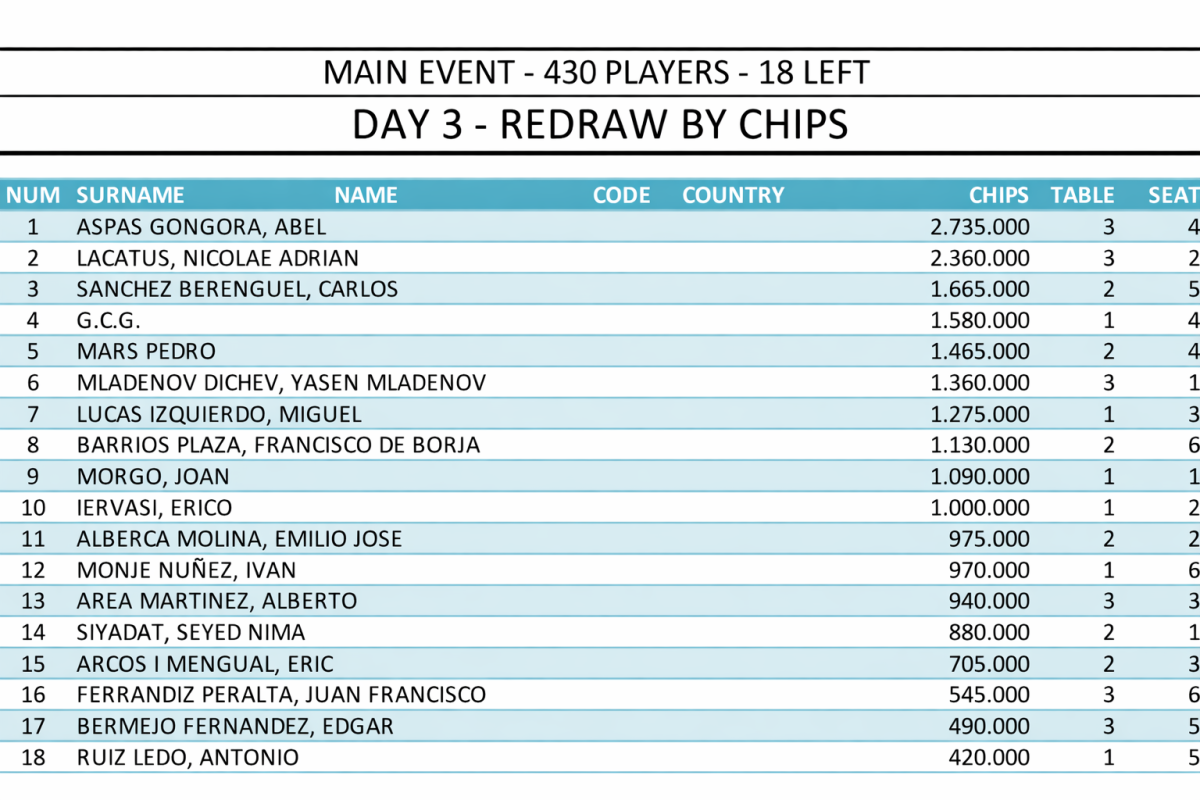 La dirección del torneo tomó la decisión de parar el reloj a falta de 18 jugadores, entre los que también se encuentra Adrián Nicolae, inmediato perseguidor de Aspas. Su conteo total ronda los 2,3 millones de puntos, una cantidad más que suficiente para plantar cara a Aspas, ya que estarán en la misma mesa. Cosas del destino.