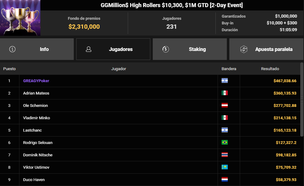 En la última mano, Adrián terminó jugándosela con  9s4s check raiseando en  6s3c3h y pusheando en turn  7s buscando meter presión y, a una mala, completando el proyecto de color en river. Esta vez salió mal, primero porque GREAGY tenía  3d2d, y segundo, porque el river no quiso colaborar. Fue un  2h y el título voló a Israel de manos de GREAgyPoker, que se proclamaba campeón contra todo pronóstico y se llevaba los 467.039 $ del primer puesto.