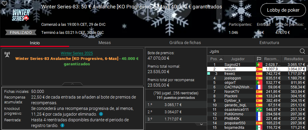 A estos resultados hay que sumar los runner ups de Lordnaipes en el 30 € Royal Rumble, el de wisukk en el 50 € Avalanche y el de Dios Morde en el The Classic.