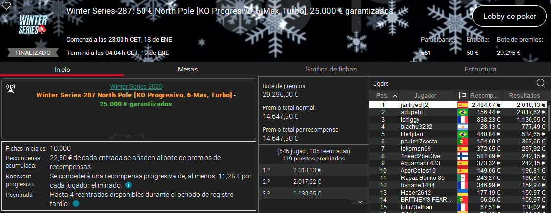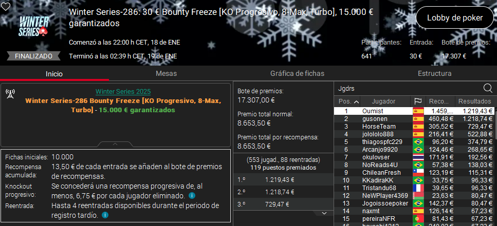 A estas dos victorias hay que sumar las que consiguieron Oumist en el 30 € Bounty Freeze y ¡¡Mosquito¡¡ en el 10 € Royal Rumble.