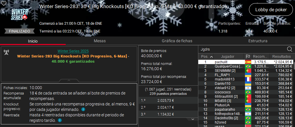 Sin embargo, la victoria más importante fue la de pachulit, que pactó en el HU del 30 € Big Knockouts para llevarse un premio total de 5.204 €.