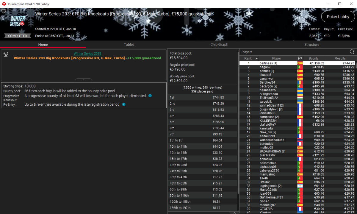 El primer oro del que hablaremos será el bertinsss, que coronó el Winter Series-203: €10 Big Knockouts (PKO 6-Max Turbo), un torneo con 2.066 entradas. La perseverancia de bertinsss tuvo premio, y es que tras disparar cuatro balas, pudo llegar a lo más alto para llevarse 745 € de premio y 1.159 € en bounties.