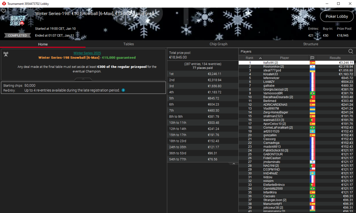 El tercero en esta lista es liaño96, que se llevó la victoria en el Winter Series-198: €50 Snowball (6-Max), que tuvo 421 entradas. Nuestro compatriota terminó embolsándose 3.246 €.