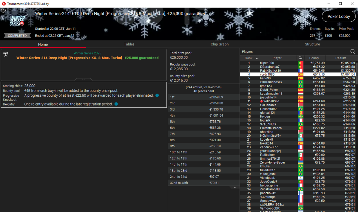 El cuarto oro lo firmó ¡GgS!11 en el Winter Series-194: €100 Deep Night (Mystery Bounty 6-Max Turbo). Con 199 entradas y un prize pool de €17.910, el español ascendió hasta la cima y se llevó 1.505 € de premio y un buen pellizco extra en sobres misterios: 2.001 €. Un título que además le deja los bolsillos llenos.