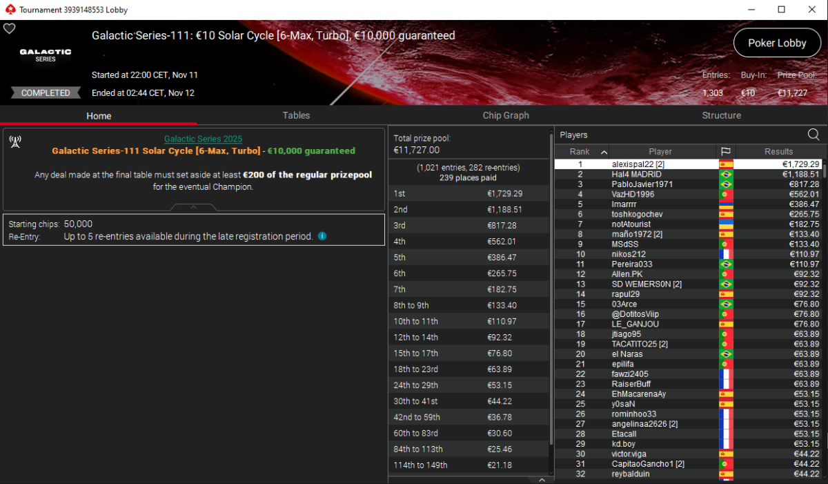 La alegría española llegó en el Galactic Series-111: €10 Solar Cycle [6-Max, Turbo]. El torneo reunió 1.303 entradas y acumuló un prize pool de €11.727, superando los €10K garantizados. El jugador español se impuso tras casi cinco horas de juego, llevándose un premio de €1.729.
