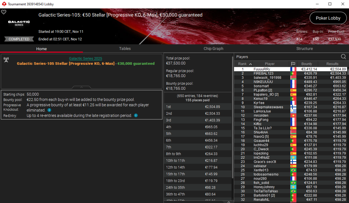 Y como guinda, el premio más grande del martes fue para el francés FuuuuRRy, quien se llevó la gloria en el Galactic Series-105: €50 Stellar [PKO, 6-Max]. El torneo, con 834 inscripciones y un bote de €37.530, coronó al campeón con un total de €5.917, repartidos entre €2.505 del premio regular y unos impresionantes €3.412 en recompensas.