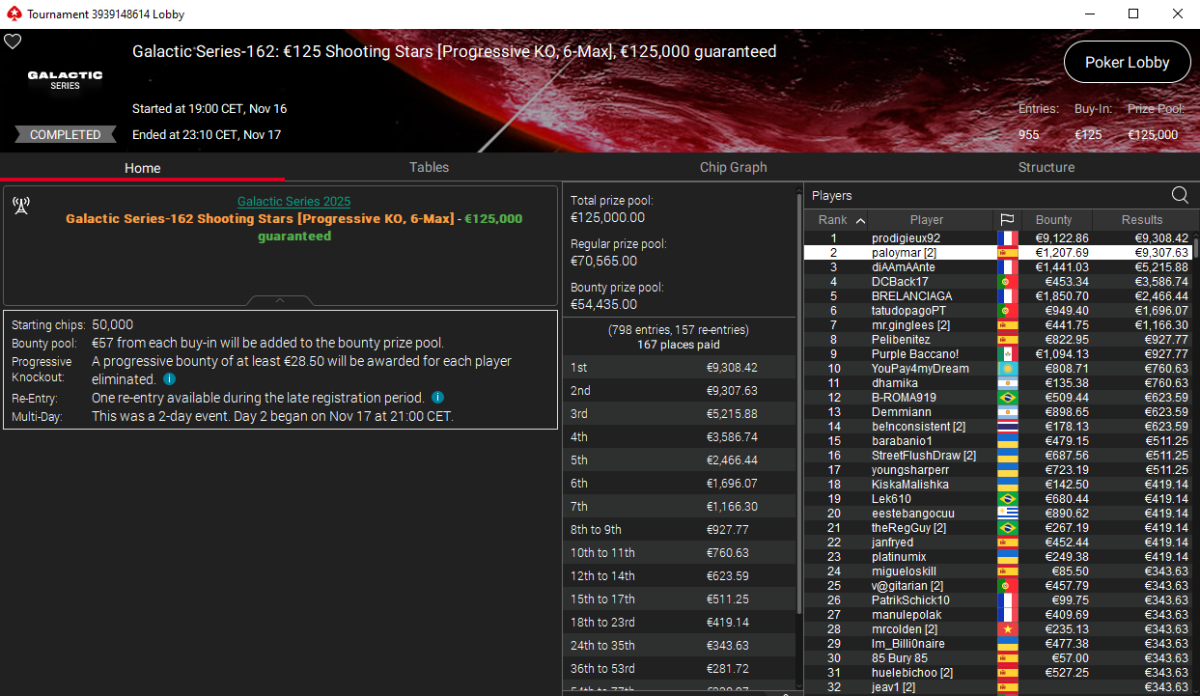 El mayor impacto económico de la noche llegó desde el GS-162 Shooting Stars de €125. En un field de 955 jugadores, el título se lo llevó prodigueux92, junto a los 18.431 € por su primer puesto y las recompensas, pero la mayor alegría hispana vino con el segundo puesto de paloymar, que transformó su inversión inicial de 125 € en un botín sideral: 10.515 € incluyendo bounties.
