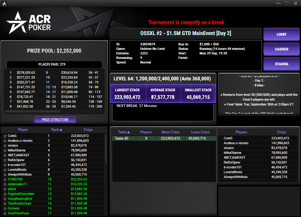 En el OSS XL #2: $1.5M GTD Main Event (buy-in $1.050), Mario se clasificó para la mesa final en un field de 2.252 entradas con un prize pool de 2,25 millones de dólares. Con un stack de 45,2M (short stack), buscará escalar posiciones hacia los $378.530 reservados al campeón.