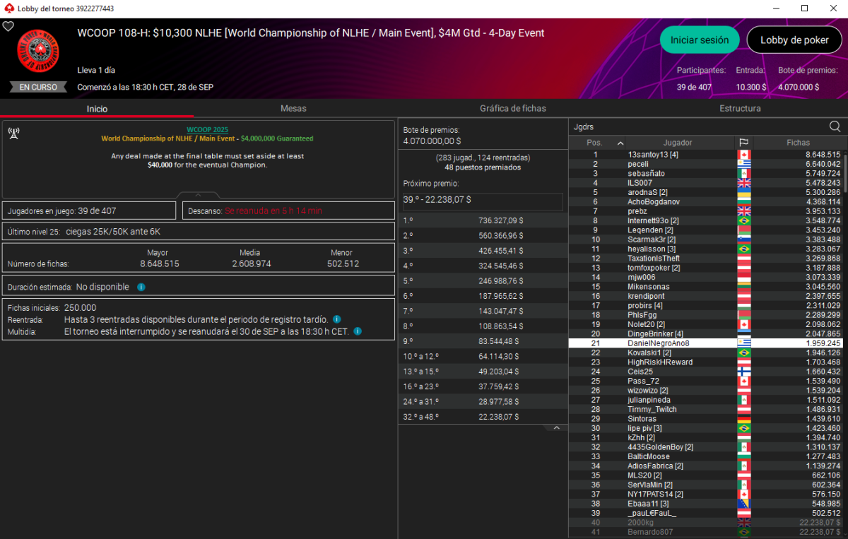 Mario, bajo bandera uruguaya y con el nick "DanielNegroAno8", es uno de los 39 jugadores que hoy pelearán por los 736.327 $ que esperan al campeón. Ahora mismo tiene asegurados 22.238 $, por lo que pase lo que pase, se embolsará seguro más de 72.000 $, aunque desde aquí le mandamos mucho ánimo para que sean cientos de miles y mañana lo podamos celebrar.