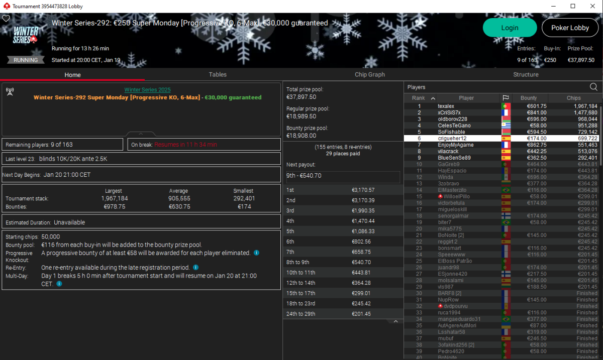 En el Winter Series-292: 250 € Super Monday [Progressive KO, 6-Max] quedan 9 jugadores y hay tres españoles en la pelea: crigueher12, vilacrack y BlueSenSe89, todos buscando meterse en la mesa final de 7.