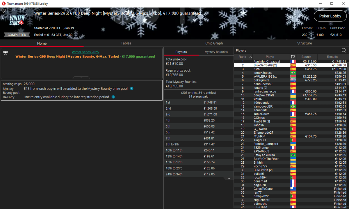 La otra plata la firmó BlueSenSe89 en el Winter Series-295: 100 € Deep Night [Mystery Bounty, 6-Max, Turbo], con 239 entradas y 21.510 € de prize pool.