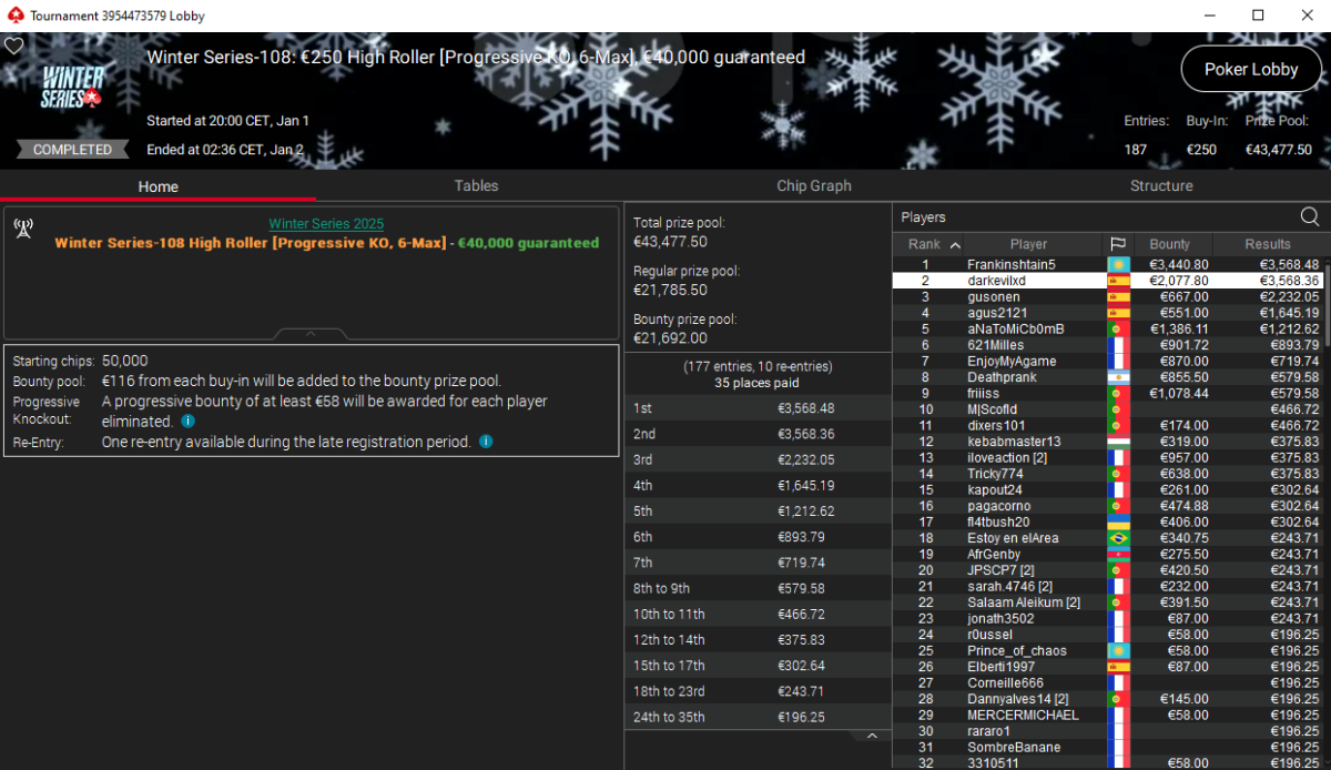 Pero si hay un nombre que destaca por impacto económico, ese es darkevilxd. El español fue segundo en el Winter Series-108 High Roller (€250 Progressive KO) y firmó el mayor cobro total español de la jornada: 5.646 €, resultado de la suma del premio por su runner-up y las recompensas por los bounties. Una cifra que sobresale por encima del resto y que convierte su resultado en uno de los más valiosos del día pese a quedarse a un paso del título.