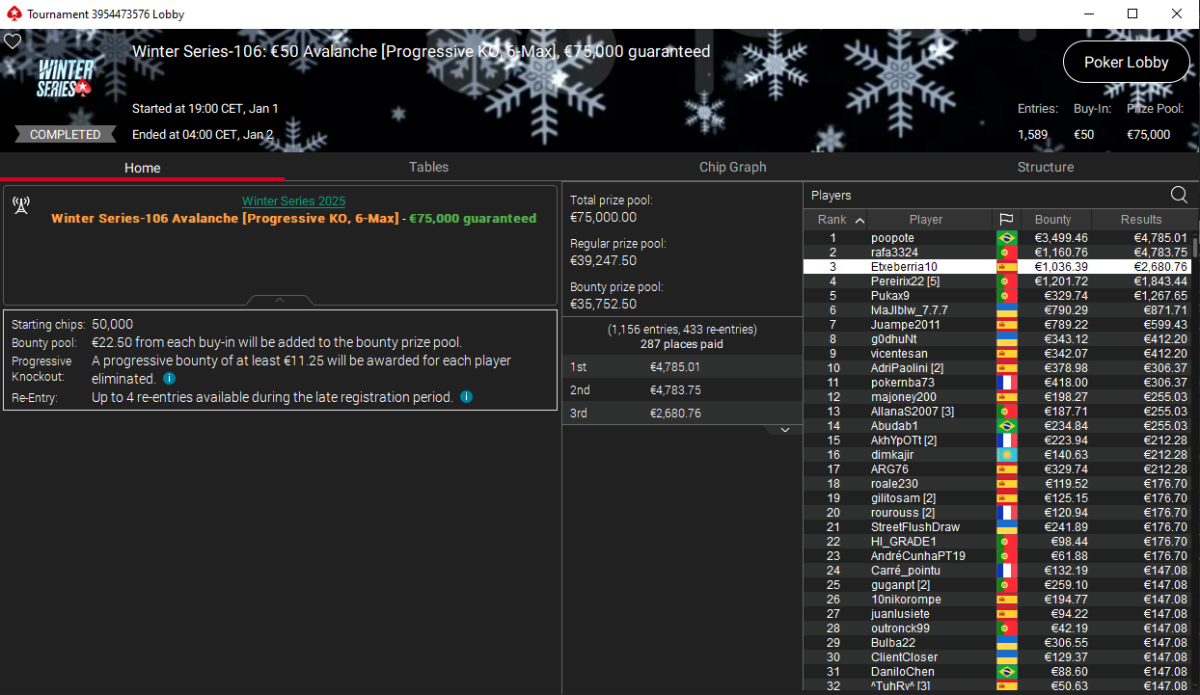 Muy cerca en importancia aparece Etxeberria10, tercero en el Winter Series-106 Avalanche (€50 PKO), con un premio total de 3.717 €, confirmando que la presencia española en los puestos nobles no era algo esporádico. Otro premio de los más importantes del día, aunque lejos del de Darkevilxd.