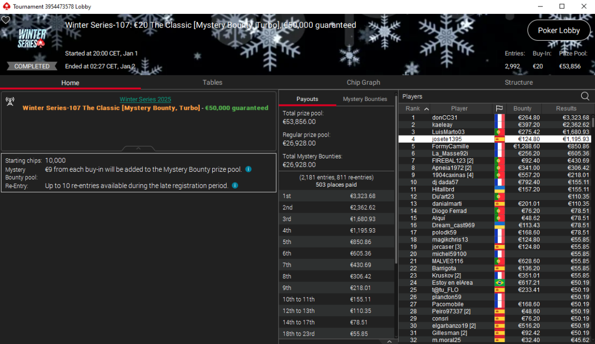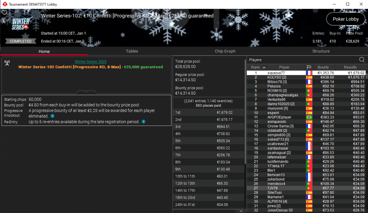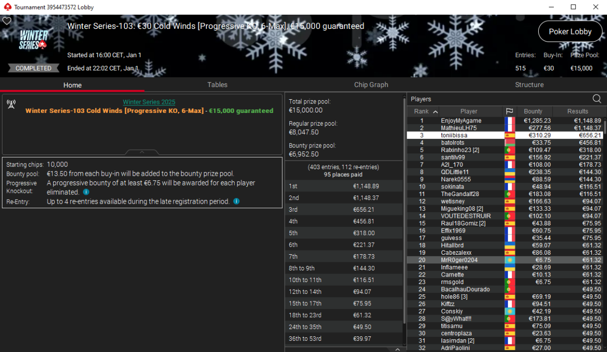 También subieron al podio KOLYSO, segundo en el Winter Series-102 Confetti (€10 PKO) con un cobro total de 2.115 € y toniibissa, tercero en el Winter Series-103 Cold Winds (€30 PKO), donde sumó 967 € en total tras una mesa final muy disputada.