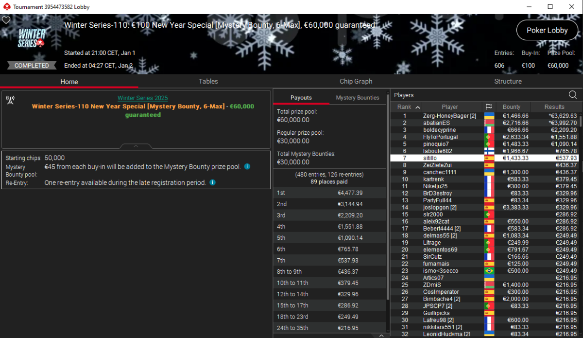 Por su parte, sitillo fue el mejor español en el Winter Series-110 New Year Special, alcanzando la séptima posición por la que se llevó 538 € de premio, aunque gracias a los sobres misteriosos se llevó otros 1.433 € para elevar sus ganancias hasta los 1.971 €.
