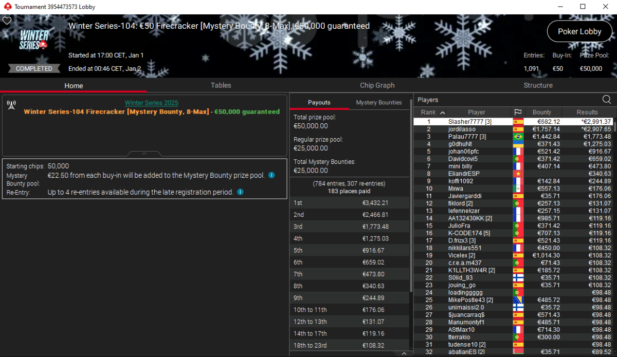 Slasher777 se llevó el Winter Series-104 Firecracker (€50 Mystery Bounty) imponiéndose a un field de 1.091 entradas y cerrando el torneo con 3.673 € a modo de recompensa, combinando premio regular y sobres mystery.