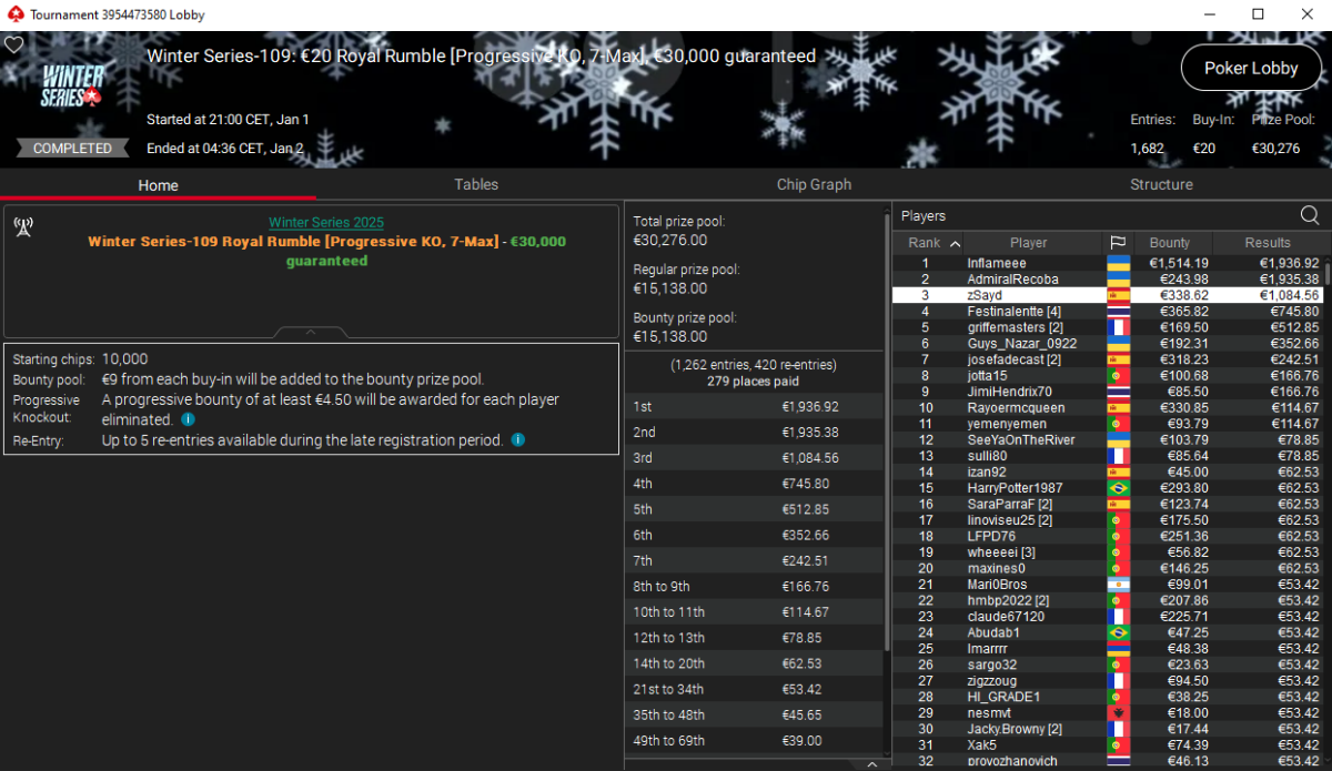 La lista de resultados destacados se completa con varios puestos de mérito. zsayd fue tercero en el Winter Series-109 Royal Rumble por 1.423 € en total, mientras que D.frizx3 acabó cuarto en el Winter Series-105 Champagne (€100 Mystery Bounty) llevándose 2.040 entre premio y sobres.