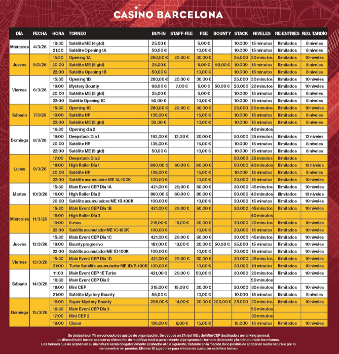 La etapa barcelonesa contará con un programa completo que incluirá 10 eventos, además de satélites presenciales, entre los que destacan el Main Event (buy-in 500€), el High Roller (1.000 €) y el Mini CEP (250€), además del Mystery Bounty (160€) o el 6-Max (250€).