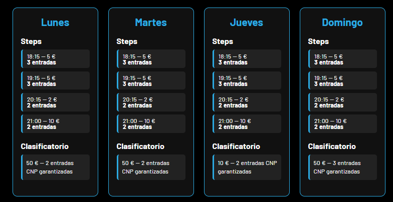 Los satélites directos (buy-in 50 €) continúan disputándose los lunes, martes, jueves y domingos, mientras que los Steps (buy-in 5 € y 2 € con recompra) se mantienen disponibles en los mismos días y en cuatro horarios distintos.