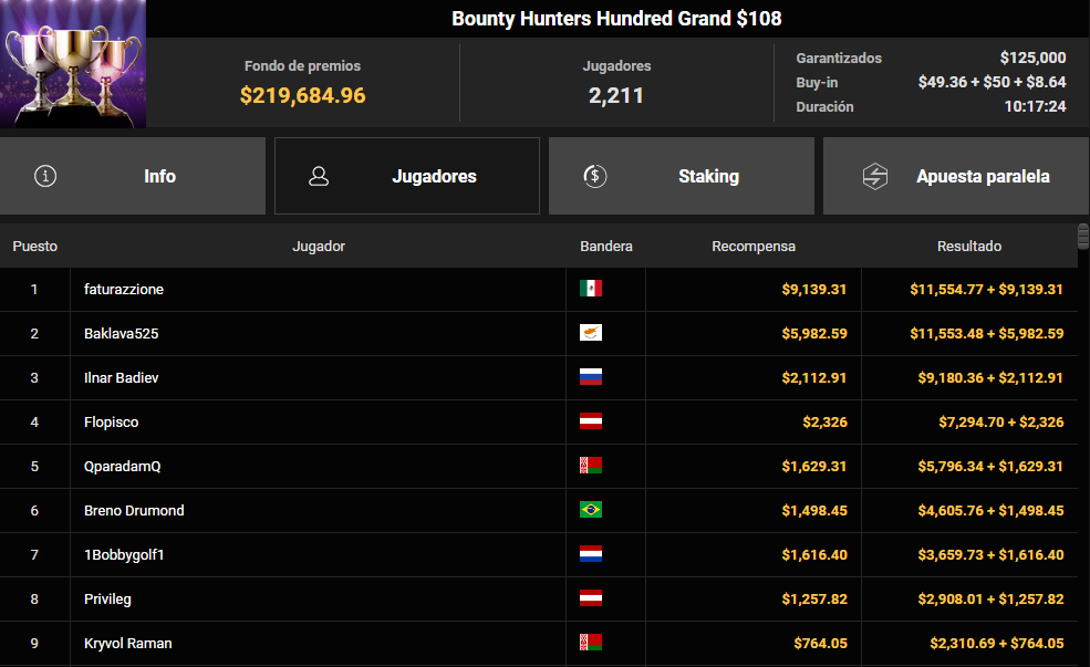 El broche al fin de semana español en GGPoker lo puso Jorge Ríos, que bajo su nick 'faturazzione' se proclamó campeón del Bounty Hunters Hundred Grand de 108 $, imponiéndose a 2.211 jugadores y sumando 20.694 $ para cerrar una sesión claramente favorable para la armada en la sala asiática.