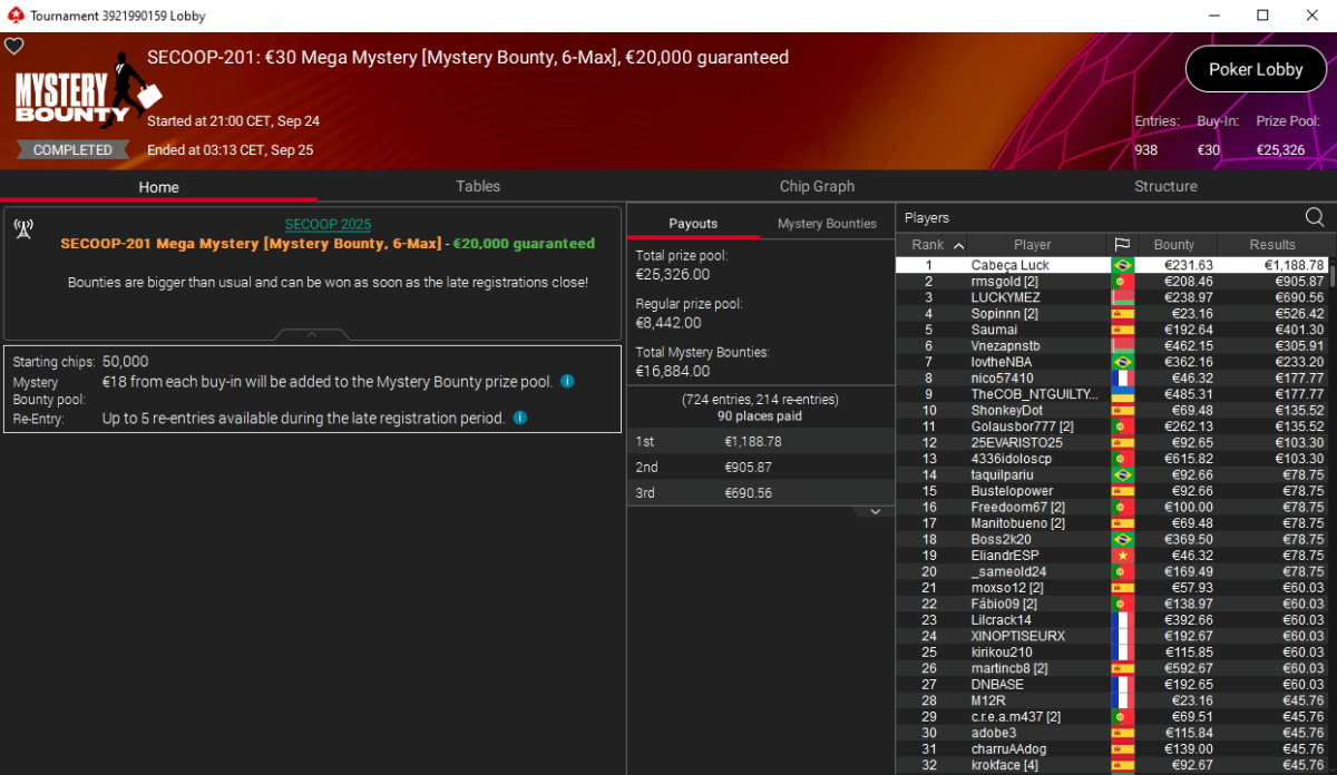 Brasil no se quedó atrás y contestó golpe por golpe. El primer estandarte llegó en el SECOOP-201: 30 € Mega Mystery [6-Max], donde Cabeça Luck superó a 937 rivales y convirtió su actuación en 1.420 €.