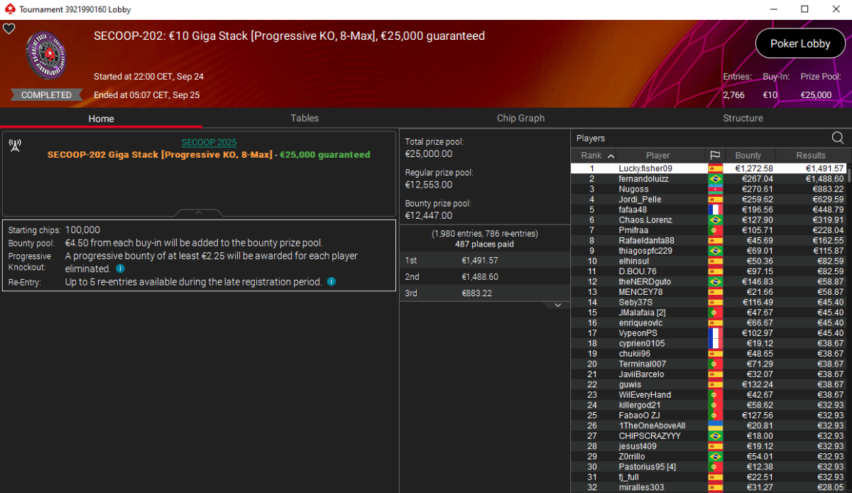 El broche final lo puso Lucky.fisher09 en el SECOOP-202: 10 € Giga Stack 8-Max, torneo que reunió nada menos que 2.766 entradas. Con paciencia, acabó convirtiendo sus 10 € de inversión en 2.764 € y en el 49º trinfuo para La Roja.