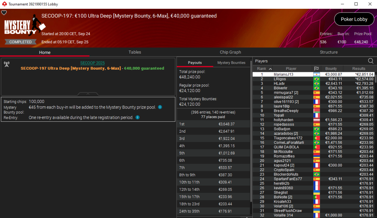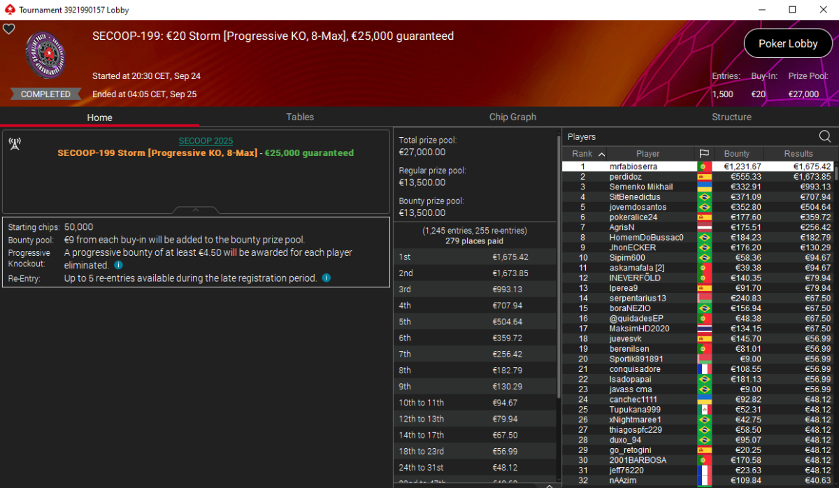 Unas horas más tarde, mrfabioserra se impuso en el SECOOP-199: 20 € Storm [PKO, 8-Max], torneo de 1.537 inscripciones, que se tradujo en 2.907 € de recompensa y otro estandarte verde y rojo para la cuenta.