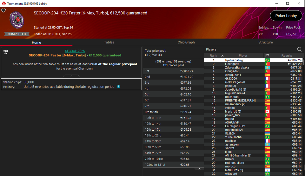 La tercera alegría fue para byebyebabyyy, campeón del SECOOP-204: 20 € Faster [PKO, 8-Max], donde superó 711 registros. Su actuación le dejó con 2.268 € en el bolsillo.