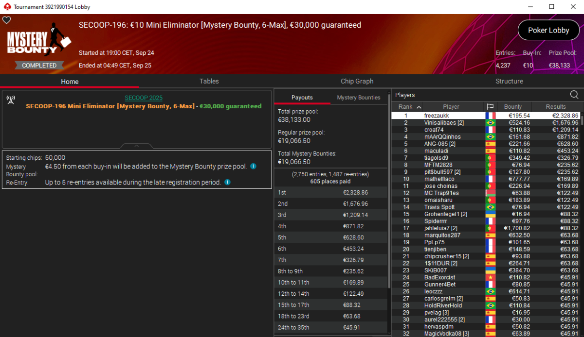 Los galos también se sumaron a la fiesta con un nuevo título. freezaukk fue el gran protagonista del SECOOP-196: 10 € Mini Eliminator [PKO, 6-Max], donde sobrevivió a un gigantesco field de 4.237 jugadores para embolsarse 2.524 € y dejar a brasil a las puertas del póker de victorias.