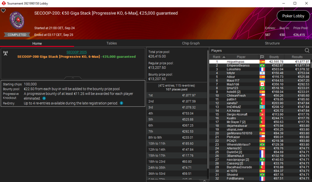 Horas después, fue MiguelRupas quien tomó el relevo en el SECOOP-200: 50 € Giga Stack 6-Max, uno de los torneos codiciados del día. Su dominio en la FT le permitió superar un field de 587 registros y embolsarse un botín de 4.444 €, el más jugoso para España en la jornada.