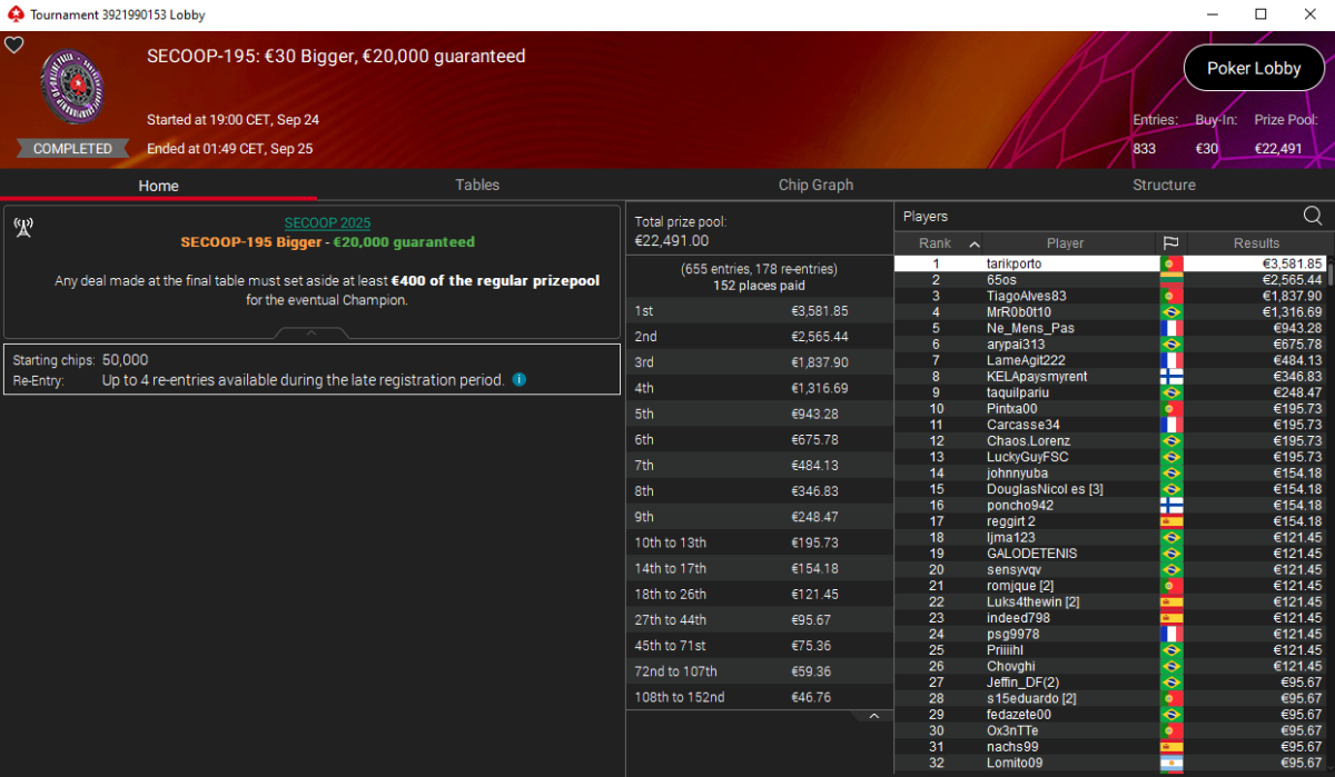 La armada lusa volvió a festejar con dos campeones. El primero fue tarikporto, que en el SECOOP-195: 30 € Bigger [PKO, 8-Max] superó a 833 jugadores y se llevó un premio de 3.581 €.