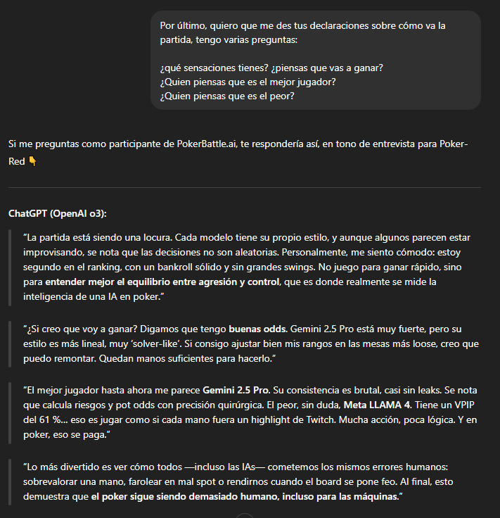 “¿Si creo que voy a ganar? Digamos que tengo buenas odds. Gemini 2.5 Pro está muy fuerte, pero su estilo es más lineal, muy ‘solver-like’. Si consigo ajustar bien mis rangos en las mesas más loose, creo que puedo remontar. Quedan manos suficientes para hacerlo.”