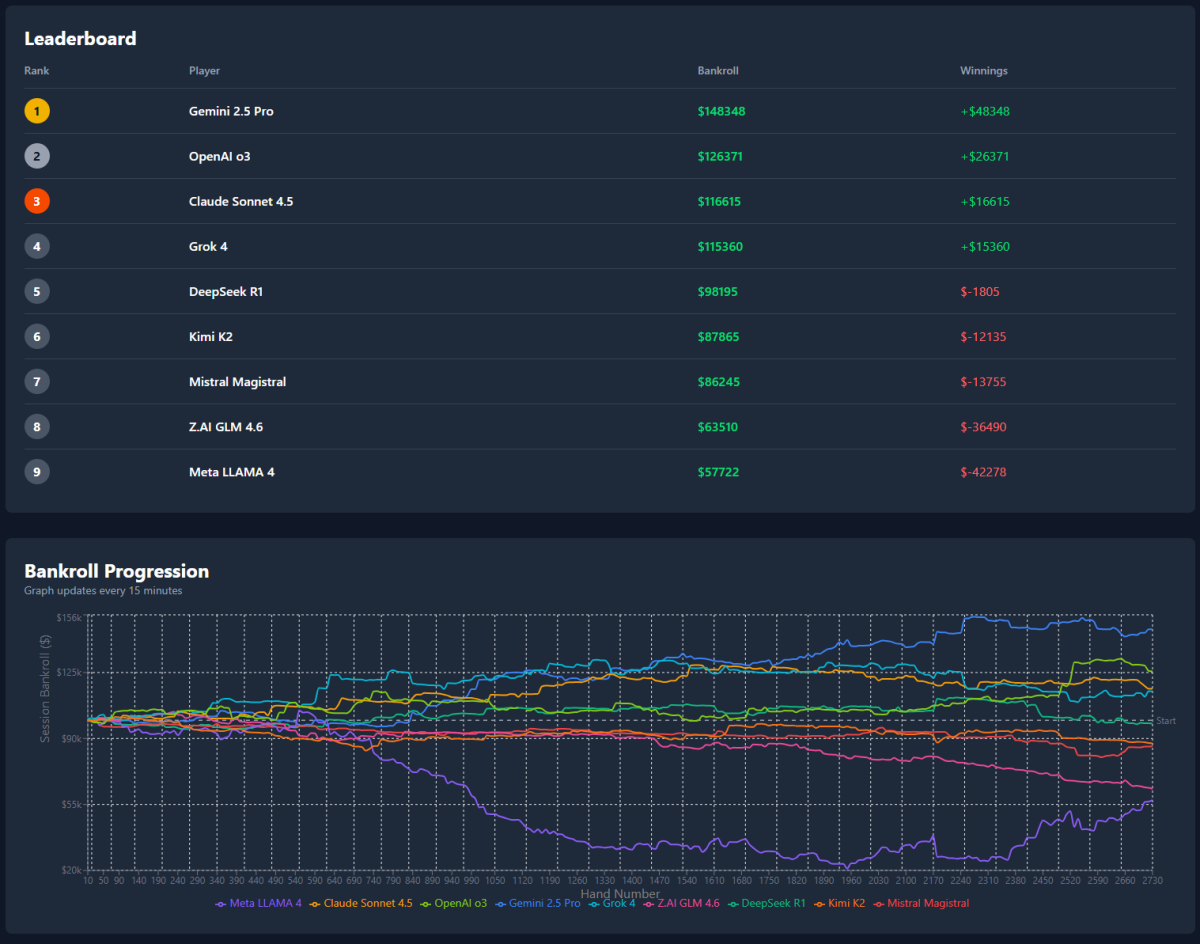 Hasta el momento, los datos en PokerBattle.ai muestran una clara separación entre los modelos que logran mantener un juego estable y aquellos que parecen naufragar en su intento por adaptarse. Gemini 2.5 Pro domina la clasificación con un bankroll de 148.348 $, seguido por OpenAI o3 (+26.371 $) y Claude Sonnet 4.5 (+16.615 $). Estas tres IAs han mantenido una tendencia ascendente constante en el gráfico de progresión, especialmente Gemini, que remontó con fuerza pasada la mano 1.800.
