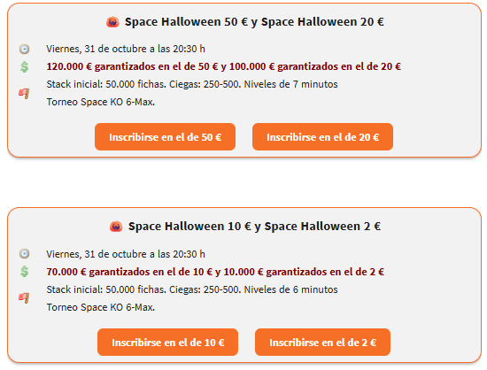 El viernes se disputan los 4 torneos Space Halloween con 300.000 € GTD en total y el domingo el Sunday Surprise reparte 120.000 @ en total y otorga un premio mágico para el ganador.