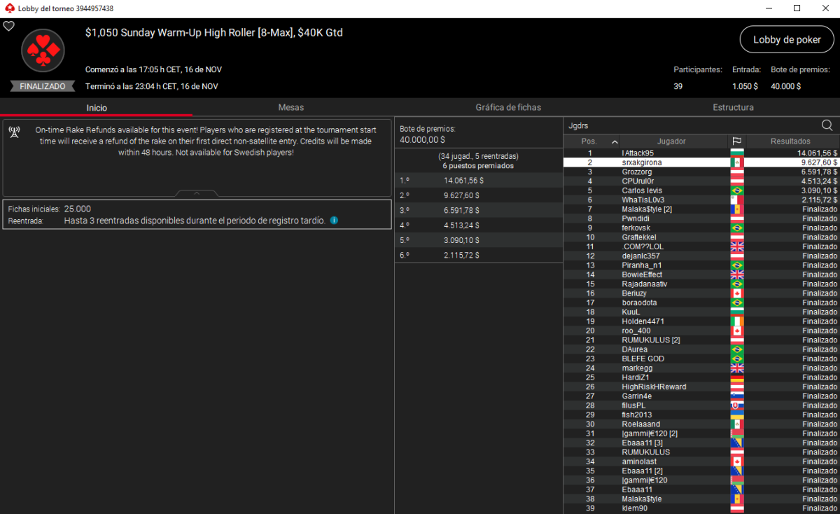 Por si fuera poco, otro español se quedó a un solo peldaño de repetir hazaña. Sergi Reixach luchó hasta la última mano del $1.050 Sunday Warm-Up High Roller, pero la victoria se le resistió y terminó firmando el segundo puesto por 9.628 $. Solo IAttack95 pudo frenarlo para colgarse el oro y llevarse los 14.062 $ del primer puesto del podio.