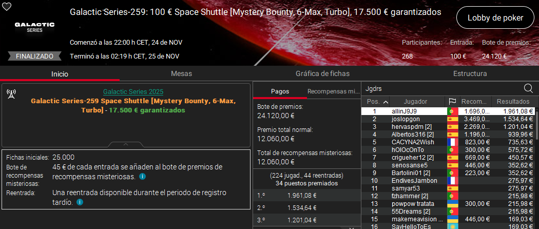Uno de los torneos más destacados en la última jornada fue el Galactic Series-259 Space Shuttle, un torneo de 100 € de entrada en el que participaron 268 jugadores para pelear por un prize pool de 24.120 €.